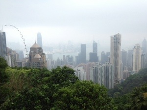 Today also started murky, but dry, and stayed dry all day thankfully. We decided we would do the number one tourist thing in Hong Kong – journey up to the Peak for a panoramic view back over the city. And to journey there in true tourist fashion: a Star ferry across the harbour from Kowloon to Hong Kong island, a bus to the peak tram terminus, and then the peak tram (a funicular railway that goes on a very steep incline straight up to the summit). It was great fun getting there, with lovely views all the way.