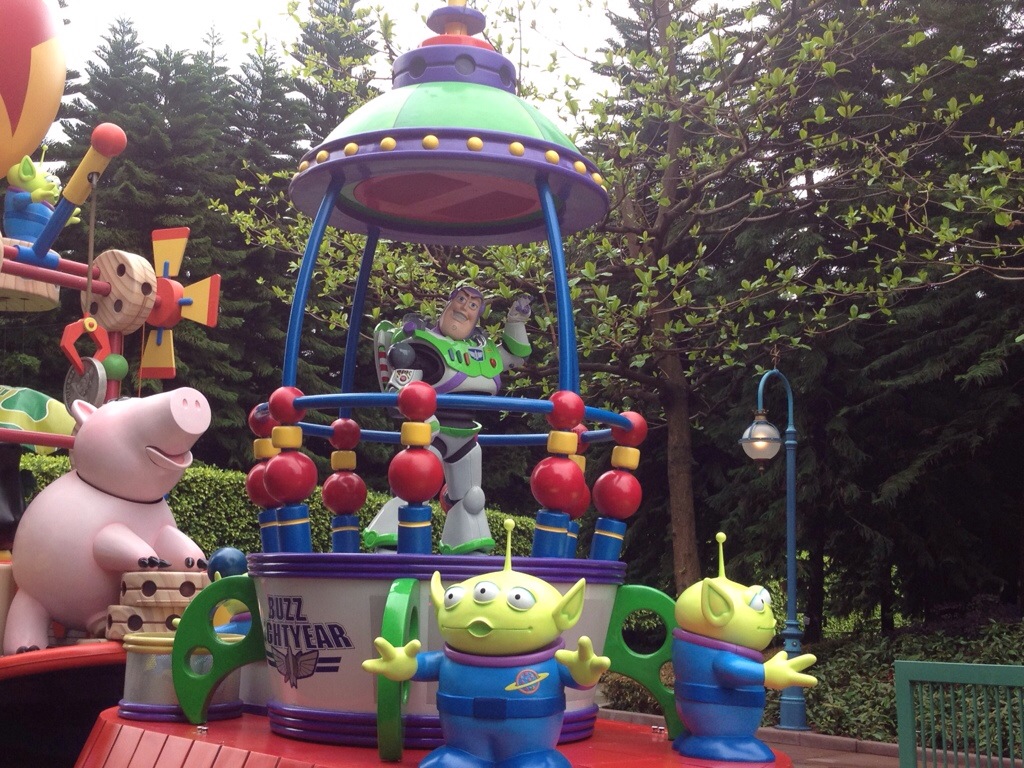 But our guide was peppiness personified. She brought us over to the (indoor!) Buzz Lightyear ride where you use a laser gun to shoot aliens. After a couple of turns on that we were (a) a bit drier and (b) a lot happier. We bought some ponchos and kept on truckin’: