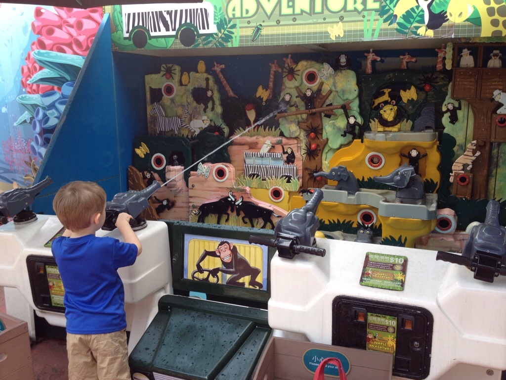 So off we went to our first ride. The honour of picking it fell to The Boy. He chose a rocket ship type thing where you go up and down and fly around in a circle. Unfortunately for him and the rest of us, it started to absolutely lash just as we were getting on. Two minutes later, and we’re all thoroughly drenched. Like drowned rats, we tottered off in search of an INDOOR ride.