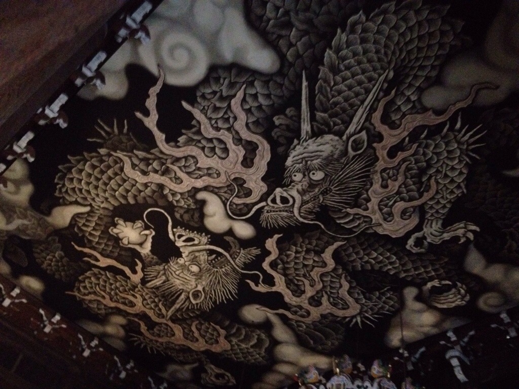 Afterwards, we headed over towards the theatre for the geisha dance show. We had time beforehand to explore the nearby Kennin-Ji temple. This temple is famous for its zen rock and gravel garden (which is indeed splendid), and also for a painting on one of the ceilings of two dragons. The Boy really liked this – he thought it was the good dragon fighting the bad one. And maybe it is…