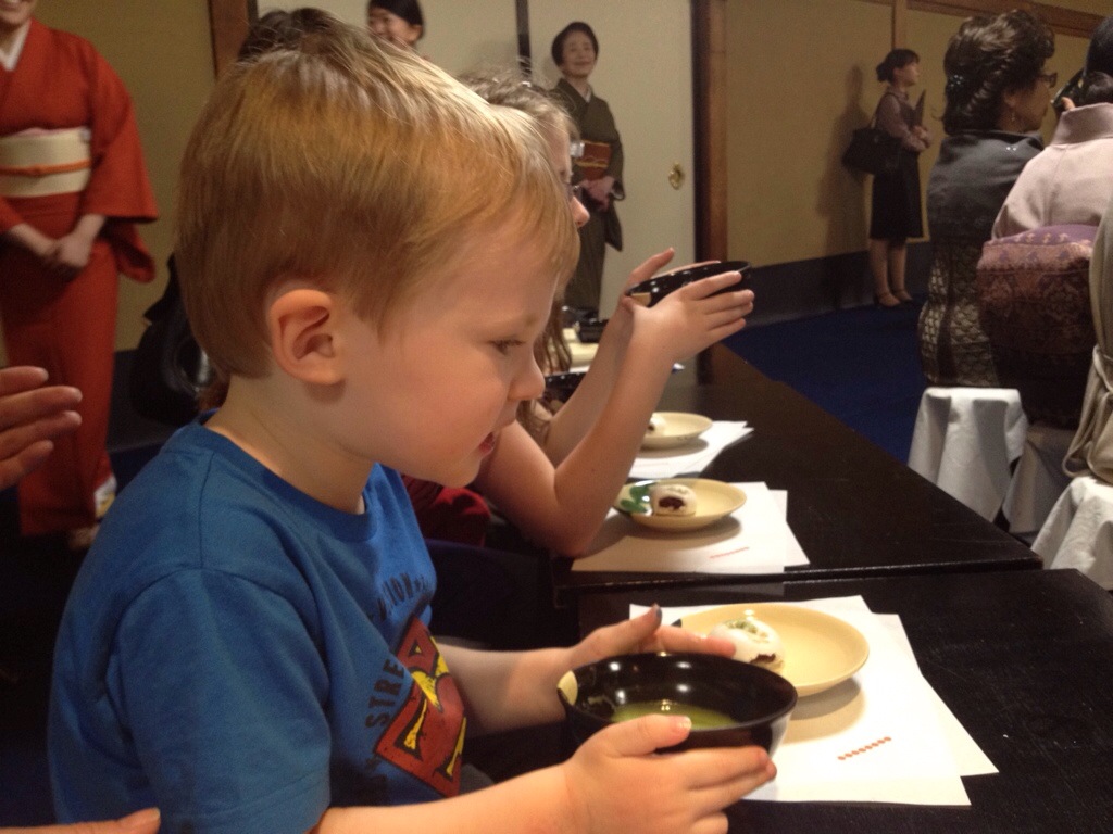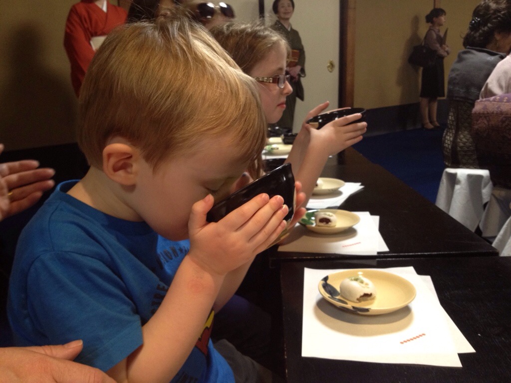 We did at least each get a bowl of the traditional thick green tea for this event (same colour and consistency as puréed peas), and a kind of mushy bun designed to mask the harsh taste of the tea. I kid you not, that is the purpose of the bun. Which begs the question as to why you drink the tea at all then. Anyway, we all gave it a go, including the kids: