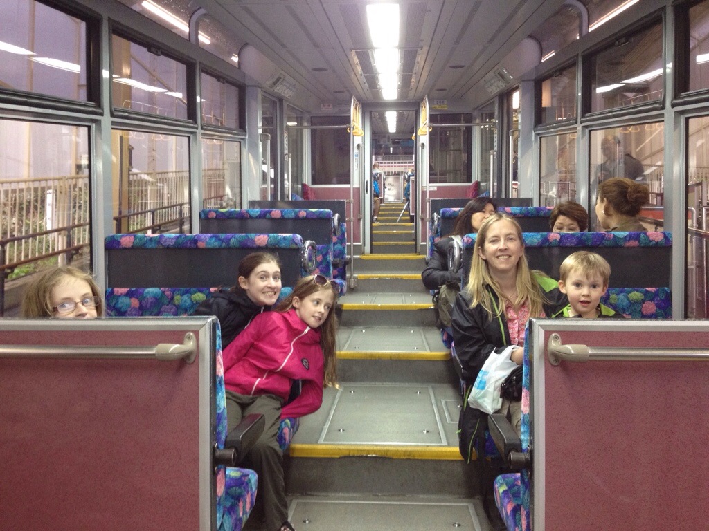 Afterwards, we took the train back to have dinner in the city. Things One and Two decided to try out the hand rings, and were proud that they were (just about, on tippy toes!) tall enough to reach them: