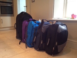 Anyway, I think we did pretty good this time. We’ve managed to confine ourselves to one carry-on size wheelie for each of the four ladies, plus a slightly larger one for the boy and me. Here’s a photo with them packed: