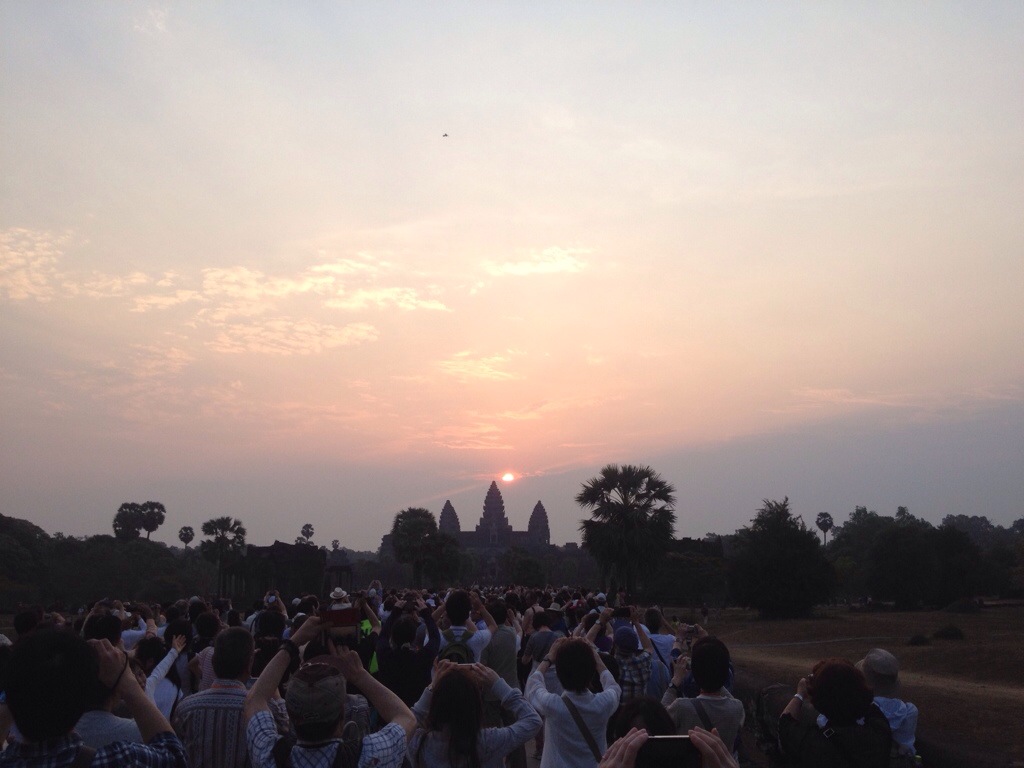 Some low-lying cloud cover meant the sunrise was a little later than scheduled. DW joined the throngs on the central causeway approaching the temple to take a photo as the sun eventually popped over the clouds. When it did, there was a sudden rush of arms in the air as the whole crowd took photos in tandem in some weird modern twist on sun-worship: