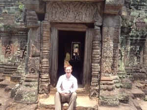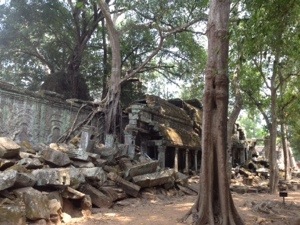 After Angkor Thom, we cycled on to our last temple for the day, Ta Prohm. This is the “temple in the jungle” of your imagination. That’s because it’s been put there by Hollywood (Indiana Jones and Lara Croft Tomb Raider were both partly shot here). Unlike the other temples, the jungle has been allowed to continue to run riot here, as the damage was so extensive. While we were there, a tour group of Buddhist monks were there at the same time, which added to the surreal feeling. Although it was funny that their must-see spot was the “Lara Croft” doorway.