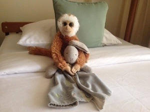 I mentioned that the staff here are great. I also mentioned Ra-Ra. The Boy also has another cuddly toy that he picked up in Singapore airport on the journey over here (in the toy shop we finally relented to letting him in to). This one is a monkey that we all named Cheeky but he calls Ooh-Ooh (matches Ra-Ra I suppose). The cleaners decided the two should have a cuddle when they made up the room: