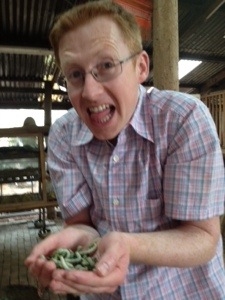 Unfortunately, The Boy was so worn out from the previous day that he was refusing to engage with the concept of temple viewing, at all. Fortunately, there was a butterfly farm nearby (we knew this in advance), so we headed there next. A swing in a basket seat, a cool drink, and a chance to let Stick Man walk up his arm lightened the mood: