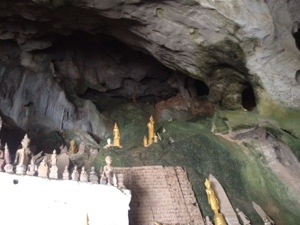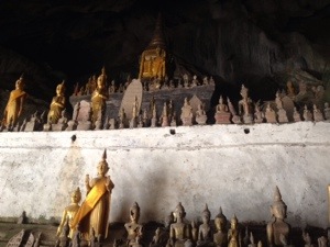 Eventually, we made it to the caves. Locals have been bringing statues of Buddha here for centuries to wish for blessings and luck. When Laos was a kingdom, the king had to come here every Laos New Year’s Day as part of the new year rituals (although most of his duties on that front were back in Luang Prabang). One of the main new year rituals is the washing of the Buddha, where water is poured down a channel by the master monk (or in this case, the king) into a tabernacle like structure with a Buddha statue inside.