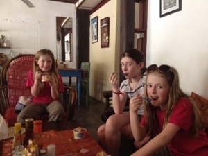 One of the (few) legacies of the French era is great bakeries and coffee shops. So further along on our stroll, we stopped in one for a floosie for me and ice-cream for the girls.