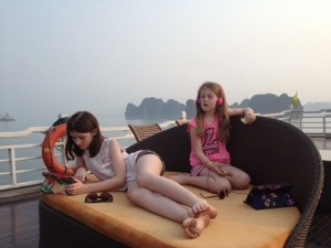 After our somewhat mixed sightseeing experience in Hanoi on Wednesday, we left the city yesterday morning for an overnight cruise on Halong Bay. The bay is famous for its many karst rocks dotted throughout, with spectacular scenery. Getting there involved a three and a half hour drive. Surprisingly, that went pretty well with no meltdowns by anyone along the way.